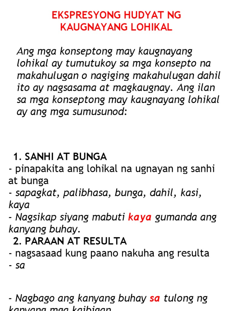 Ng Sanhi at Bunga Panghihikayat at Pagpapahayag ng Saloobin 1. Ang sanhi ay isang ideya o pangyayari na maaaring humantong sa isang bunga. Sapagkat DahilDahil sa Dahilan ng Palibhasa Ngunit At sa Ang bunga ay ang kinalabasan o resulta ng isang ideya o pangyayari.