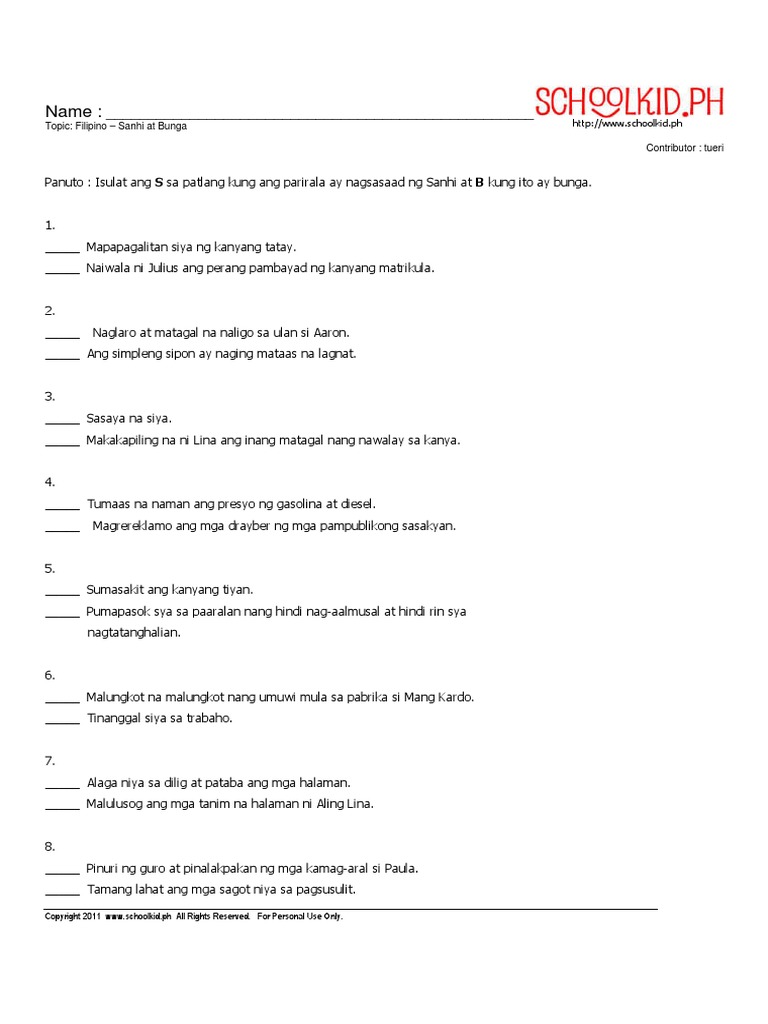 Ang sanhi ay tumutukoy sa pinagmulan o dahilan ng isang pangyayari samantala ang bunga naman ay ang siyang kinalabasan o dulot ng naturang pangyayari. Feel free to download print and photocopy these worksheets for your students or children. PAGBASA - ay ang pagkilala at pagkuha ng mga ideya at kaisipan sa mga sagisag na nakalimbag.