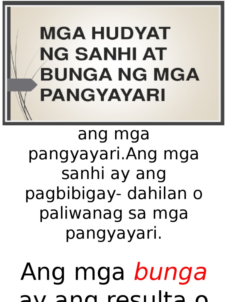Sabihin kung Sanhi o Bunga ang nakapaloob sa. Kapag nauuna ang sanhi. Samantalang inilalahad naman sa bunga o resulta ang naganap na pangyayari na magiging batayan ng tao kung nabigo o matagumpay.