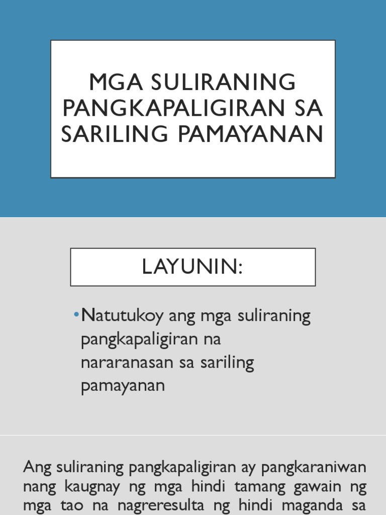 Tangi sa mga nabanggit sa itaas kasama rin sa mga suliraning pangkapaligiran ng Pilipinas ang man-made calamities Ito ay ang mga kalamidad na bunga ng mga gawain ng mga tao na mabibilang din na kontemporaryong isyu. Academiaedu is a platform for academics to share research papers. ISYUNG PANGKAPALIGIRAN Sa paksang ito ating pag-aaralan kung ano nga ba ang mga halimbawa ng isyung pangkapaligiran at ang kahulugan nito.